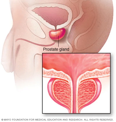 The prostate is a gland in men that sits just below the bladder. The prostate produces the fluid surrounding sperm. When this gland becomes enlarged, it can block the flow of urine, leading to problems with the kidney.